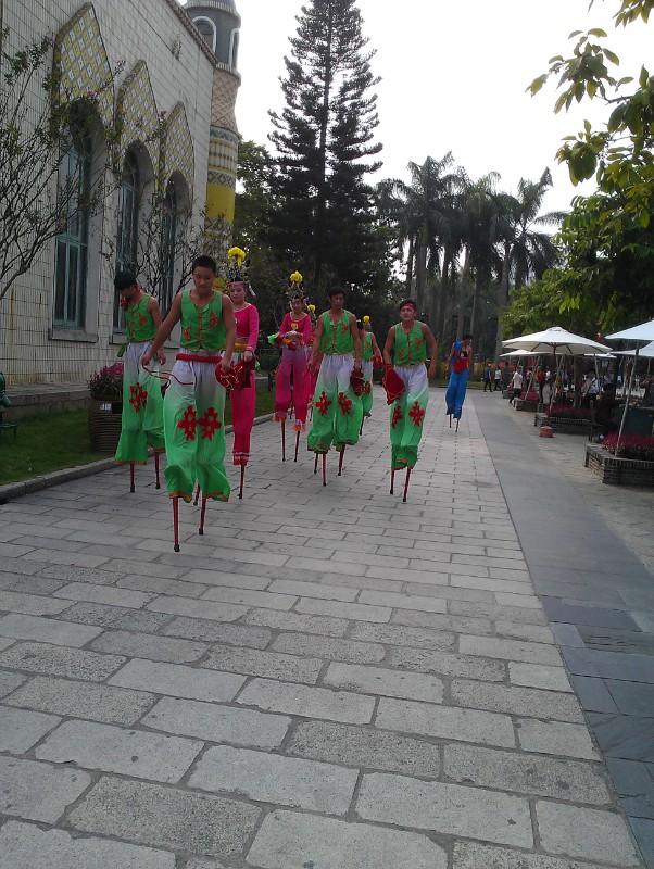 第三天我們留給了具有現(xiàn)代化氣息的東部華僑城(簡(jiǎn)稱OCT.east )。 這是一個(gè)世界級(jí)的度假村,分三大區(qū) ,充分體現(xiàn)了自然與人的和諧共處。高爾夫球場(chǎng)的綠茵萬(wàn)頃,大華興寺的香火繚繞,竹林深處的曲徑通幽,梯形茶田的清新蕩氣,五色花田的炫彩芬芳,因特拉根蘭花園的奇特浪漫,還有穿插其間各種先進(jìn)娛樂設(shè)施帶給你無(wú)限的激情挑戰(zhàn),無(wú)論是釋放壓力,尋找田園的僻靜,還是放慢生活的腳步,這無(wú)疑是一片最接近心靈的土壤。它是一個(gè)天然大氧吧,你可以盡情暢快的深呼吸,吸收山水的靈氣 。在這有一個(gè)特殊的文化氛圍,那便是華僑風(fēng)情。歌舞表演非常具有歐美范兒,熱辣搞笑。周圍建筑也是一派西式洋房,頗有情調(diào)。一個(gè)朋友叫我到塑像前拍照,剛開始我都沒從正面瞧,只知道是個(gè)帥哥鍋拿著把吉他,都沒有意識(shí)到是活的,擺動(dòng)作時(shí),我無(wú)意碰到他的肩膀便嚇了一個(gè)狠的,我以為是瞬間激活呢,弄得那尊“雕像”都移位了,看他快要倒了,還使勁的拉,拉了幾個(gè)來(lái)回。在場(chǎng)所有人都笑趴了,唯有這位銅人依舊從容淡定。可是當(dāng)我們走時(shí),他狡黠的來(lái)回轉(zhuǎn)動(dòng)了他那兩只圓滾滾的眼珠。如果在里面走累了,可以租腳踏車,乘游覽車、觀光大巴,還可以坐索道或者體驗(yàn)深林小火車穿梭蜿蜒其中。